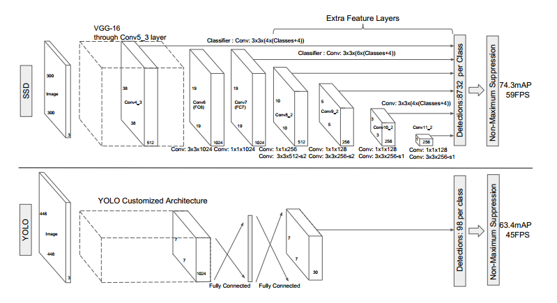 VGG中的 某些层以及VGG后面又添加的一些层中的某些层,被用来检测和分类。不同的feature layer 预测的bounding box的scale是不一样的,因此不同feature layer上的卷积模型也是不一样的(体现在参数和回归效果上)。