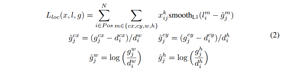 - l 代表预测bounding box与default box之间的变换关系, g 代表的是ground truth box与default box之间的变换关系。