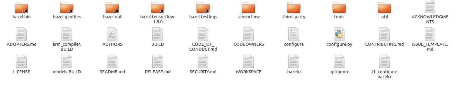解压刚刚得到的两个文件夹,进入tensorflow文件夹,可以看到bazel-bin,bazel-genfiles,bazel-out,bazel-tensorflow-1.8.0以及bazel-testlogs大小都为0,直接删去。