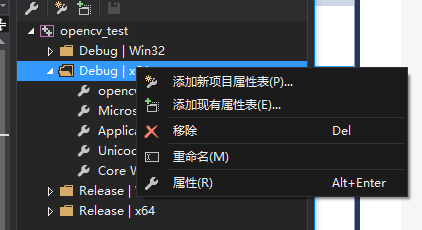 右击Debug x64,选择添加新项目属性表,命名为opencvPropertySheet