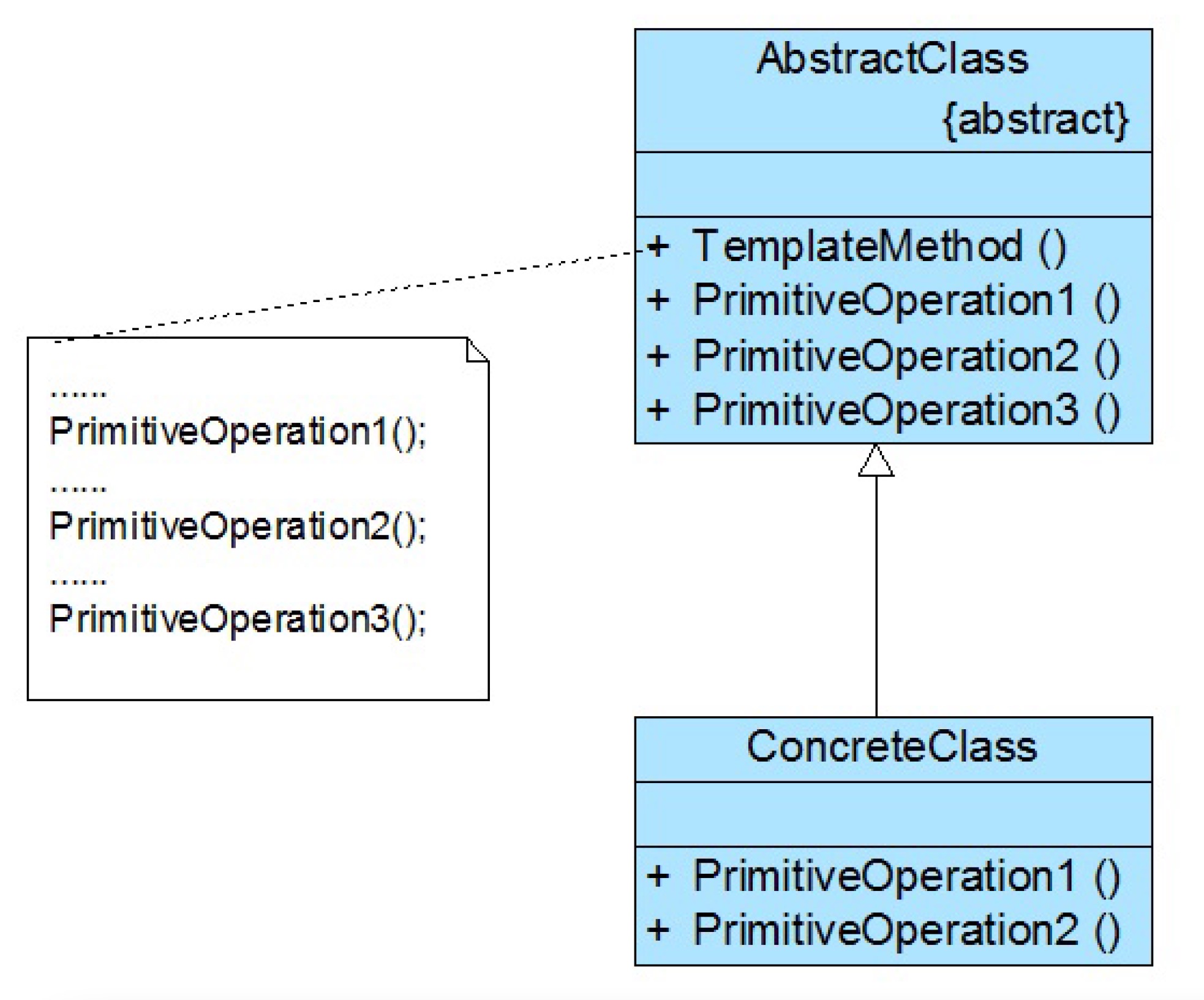 - 模板方法模式是一种代码复用技术,它在类库设计中尤为重要,它提取了类库中的公共行为,将公共行为放在父类中,而通过其子类来实现不同的行为,它鼓励我们恰当使用继承来实现代码复用。