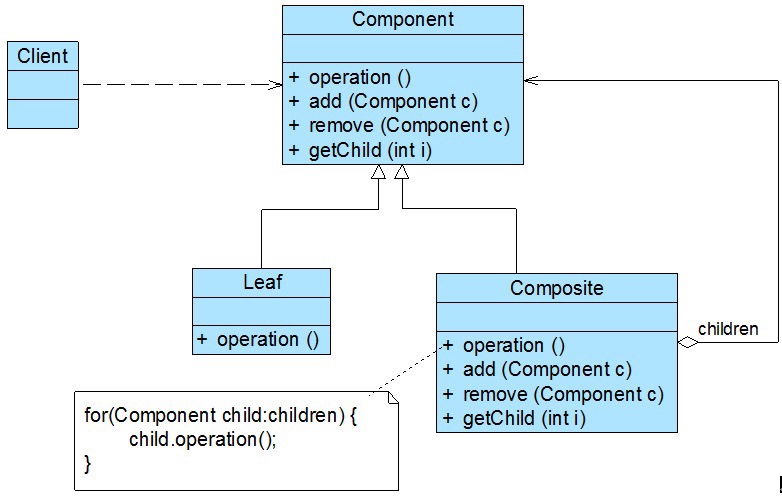 组合模式中包含抽象构件类(Component)、叶子构件类(Leaf)以及容器构件类(Composite)。