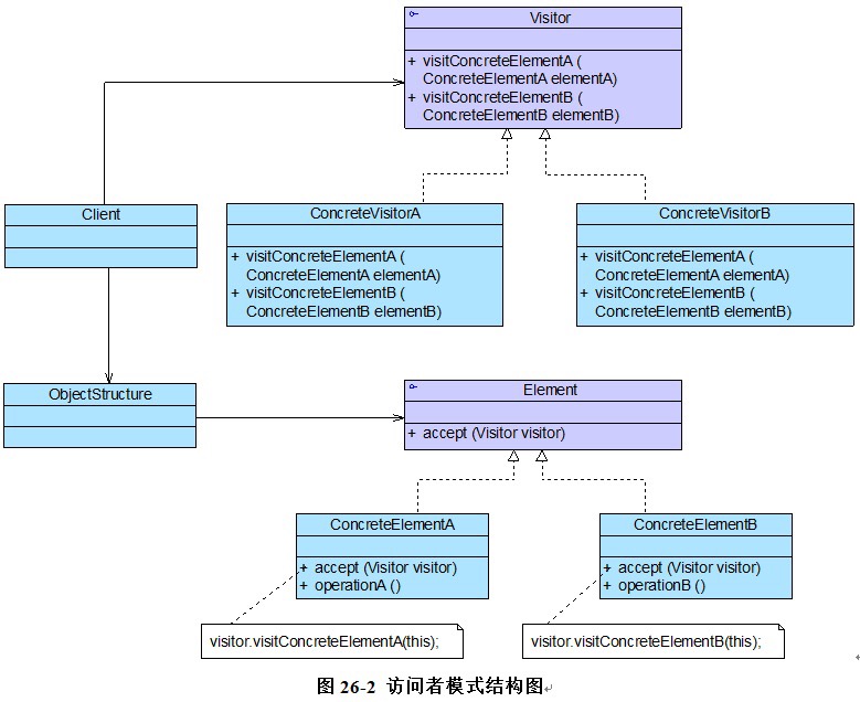 在使用访问者模式时,被访问元素通常不是单独存在的,它们存储在一个集合中,这个集合被称为“对象结构”,访问者通过遍历对象结构实现对其中存储的元素的逐个操作。